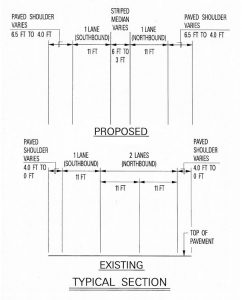 Installation of the shoulders in each direction would mean a reduction in northbound travel lanes from the current configuration of two lanes to one lane. In the proposed concept, the center lane would be removed to provide additional shoulder space and a center median to separate the northbound and southbound lanes.