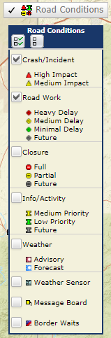 As shown at left, clicking the tab for “Road Conditions” and checking boxes labeled “Road Work” and “Closures” allow weekend warriors to learn about any projects and restrictions that can affect travel.
