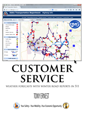 In the Customer Service category, improvements to the 511 Traveler Services platform will allow drivers to track weather conditions on certain highway routes. ITD partnered with the National Weather Service in Pocatello to add a forecast feature. The platform takes specific forecast information from areas along a section of highway, and creates an overall forecast for that route. This gets useful information to the traveling public, at their fingertips.